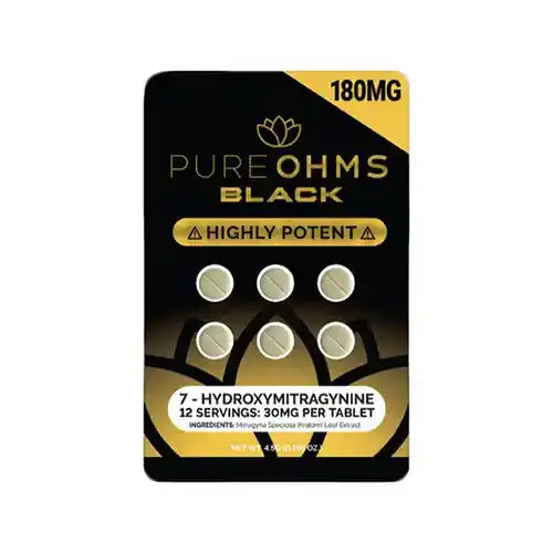 Grab a convenient 6-pack of Pure Ohms Black 7-OH Tablets! Each high-quality chewable tablet is precisely packed with 30mg of 7-Hydroxymitragynine, split into two easy-to-consume 15mg servings. Made for experienced 7OH users seeking a powerful boost on the go.